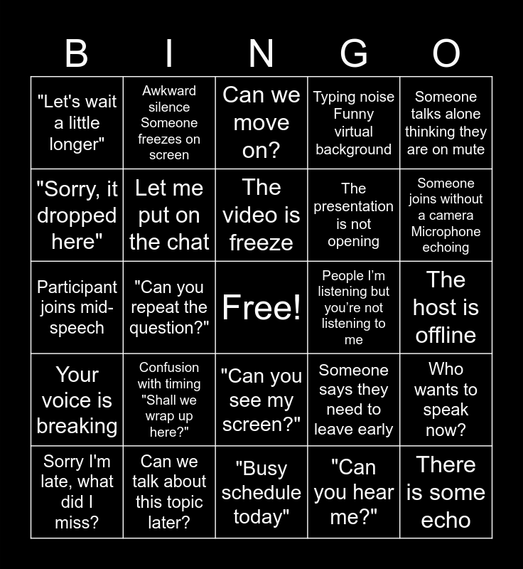 This bingo card has a free space and 33 words: You are on mute, Connection problem, "Can you see my screen?", Arrived 5 minutes late, Someone joins without a camera Microphone echoing, "Let's wait a little longer", "Can you repeat the question?", Pet appears on camera Child shouts in the background, Typing noise Funny virtual background, Someone calls the wrong name, "Sorry, it dropped here", Awkward silence Someone freezes on screen, "Share the link in the chat", "Can you hear me?", Someone talks alone thinking they are on mute, Participant joins mid-speech, Confusion with timing "Shall we wrap up here?", "Busy schedule today", Someone says they need to leave early, The host is offline, Sorry I'm late, what did I miss?, Can you please mute your microphone?, Can we move on?, People I’m listening but you’re not listening to me, There is some echo, Your voice is breaking, Let me put on the chat, The video is freeze, The presentation is not opening, Who wants to speak now?, Is it clear for all?, Can we talk about this topic later? and Where is the sharing bottom?.