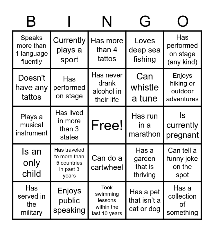 This bingo card has a free space and 24 words: Has served in the military, Has traveled to more than 5 countries in past 3 years, Has never drank alcohol in their life, Has a pet that isn’t a cat or dog, Has performed on stage (any kind), Speaks more than 1 language fluently, Currently plays a sport, Has more than 4 tattos, Has run in a marathon, Is currently pregnant, Plays a musical instrument, Has performed on stage, Has a garden that is thriving, Can tell a funny joke on the spot, Doesn't have any tattos, Enjoys public speaking, Took swimming lessons within the last 10 years, Loves deep sea fishing, Enjoys hiking or outdoor adventures, Is an only child, Has lived in more than 3 states, Can do a cartwheel, Can whistle a tune and Has a collection of something.