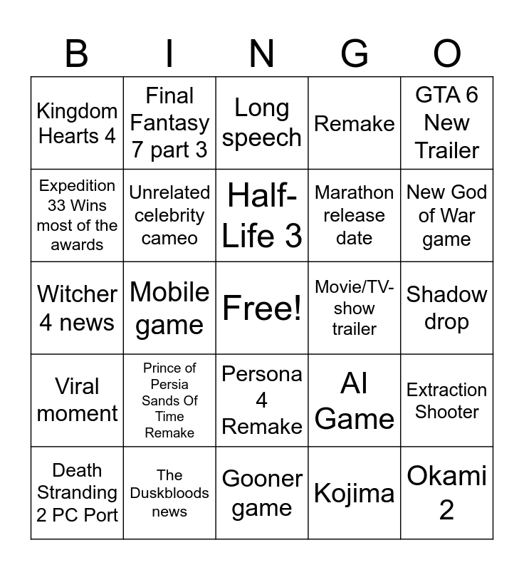 This bingo card has a free space and 24 words: Prince of Persia Sands Of Time Remake, The Duskbloods news, Half-Life 3, Death Stranding 2 PC Port, GTA 6 New Trailer, Kingdom Hearts 4, Expedition 33 Wins most of the awards, Final Fantasy 7 part 3, Movie/TV-show trailer, Persona 4 Remake, Marathon release date, Witcher 4 news, AI Game, Extraction Shooter, Unrelated celebrity cameo, Kojima, Shadow drop, Long speech, New God of War game, Mobile game, Okami 2, Viral moment, Remake and Gooner game.