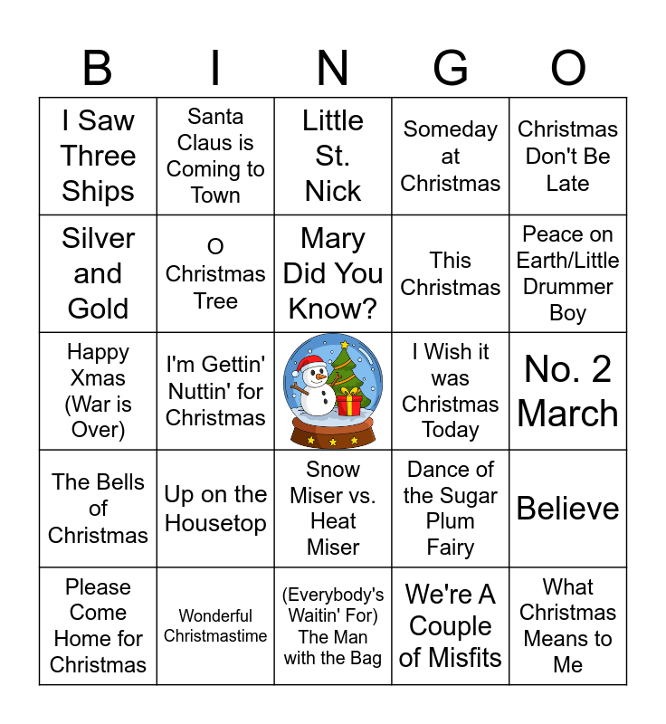 This bingo card has a free space and 39 words: 12 Days of Christmas, We Need a Little Christmas, Christmas Wrapping, O Christmas Tree, Please Come Home for Christmas, Snow Miser vs. Heat Miser, Mary Did You Know?, Where Are You Christmas?, Christmas Don't Be Late, The Bells of Christmas, I'm Gettin' Nuttin' for Christmas, Someday at Christmas, What Christmas Means to Me, No. 2 March, I Wish it was Christmas Today, Up on the Housetop, Christmas (Baby Please Come Home), I Saw Three Ships, The Hanukkah Song, Dance of the Sugar Plum Fairy, Silver and Gold, (Everybody's Waitin' For) The Man with the Bag, This Christmas, Peace on Earth/Little Drummer Boy, Baby It's Cold Outside, When Christmas Comes to Town, My Favorite Things, River, Do You Hear What I Hear?, Santa Claus is Coming to Town, Santa Tell Me, Hard Candy Christmas, Little St. Nick, Wonderful Christmastime, We're A Couple of Misfits, Merry Christmas, Happy Holidays, Believe, Happy Xmas (War is Over) and My Only Wish.