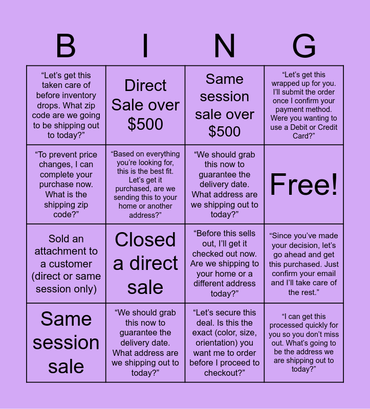 This bingo card has 18 words: Closed a direct sale, “I can get this processed quickly for you so you don’t miss out. What’s going to be the address we are shipping out to today?”, Same session sale over $500, “Let’s get this taken care of before inventory drops. What zip code are we going to be shipping out to today?”, “Before this sells out, I’ll get it checked out now. Are we shipping to your home or a different address today?”, “Let’s get this wrapped up for you. I’ll submit the order once I confirm your payment method. Were you wanting to use a Debit or Credit Card?”, Same session sale, Direct Sale over $500, Free!, Sold an attachment to a customer (direct or same session only), “Let’s secure this deal. Is this the exact (color, size, orientation) you want me to order before I proceed to checkout?”, “To prevent price changes, I can complete your purchase now. What is the shipping zip code?”, “Since you’ve made your decision, let’s go ahead and get this purchased. Just confirm your email and I’ll take care of the rest.”, “Based on everything you’re looking for, this is the best fit. Let’s get it purchased, are we sending this to your home or another address?”, “We should grab this now to guarantee the delivery date. What address are we shipping out to today?”, “This is ready to go in your cart. I’ll check out with your saved card unless you prefer a different one.”, “We should grab this now to guarantee the delivery date. What address are we shipping out to today?” and Got a same session sale.