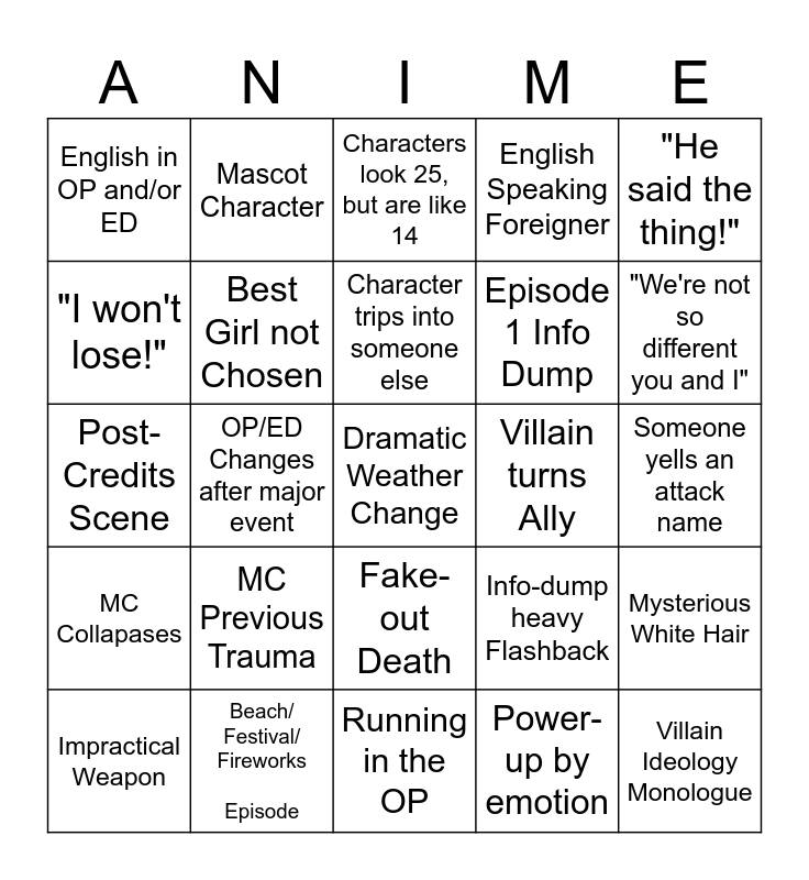 This bingo card has a free space and 24 words: MC Previous Trauma, Beach/ Festival/ Fireworks Episode, Character trips into someone else, Impractical Weapon, "He said the thing!", English in OP and/or ED, "I won't lose!", Mascot Character, Villain turns Ally, Fake-out Death, Episode 1 Info Dump, Post-Credits Scene, Info-dump heavy Flashback, Mysterious White Hair, Best Girl not Chosen, Power-up by emotion, Someone yells an attack name, Characters look 25, but are like 14, "We're not so different you and I", OP/ED Changes after major event, Villain Ideology Monologue, MC Collapases, English Speaking Foreigner and Running in the OP.
