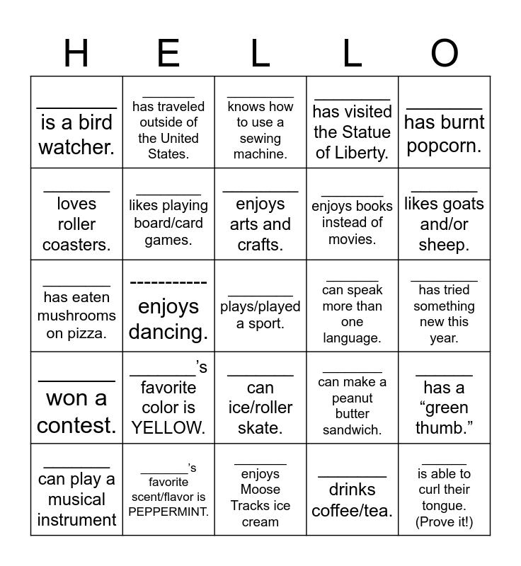 This bingo card has 25 words: _______’s favorite color is YELLOW., _______ enjoys Moose Tracks ice cream, ________ enjoys arts and crafts., _______ can play a musical instrument, _______ has burnt popcorn., _______ is a bird watcher., _______ loves roller coasters., _______ has traveled outside of the United States., _______ can speak more than one language., _______ can ice/roller skate., ________ enjoys books instead of movies., ________ has eaten mushrooms on pizza., ________ can make a peanut butter sandwich., ______ has a “green thumb.”, ________ likes playing board/card games., ______ is able to curl their tongue.(Prove it!), _________ has tried something new this year., _________ knows how to use a sewing machine., _______ likes goats and/or sheep., ----------- enjoys dancing., ________ plays/played a sport., _______’s favorite scent/flavor is PEPPERMINT., ______ won a contest., ________ has visited the Statue of Liberty. and _______ drinks coffee/tea..
