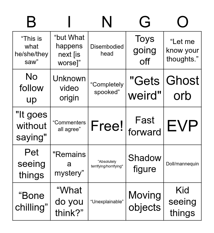 This bingo card has a free space and 24 words: "Remains a mystery”, “What do you think?”, “Completely spooked”, “Bone chilling”, “Let me know your thoughts.”, “This is what he/she/they saw”, No follow up, “but What happens next [is worse]”, Fast forward, “Absolutely terrifying/horrifying", "Gets weird", "It goes without saying", Shadow figure, Doll/mannequin, Unknown video origin, Moving objects, EVP, Disembodied head, Ghost orb, “Commenters all agree”, Kid seeing things, Pet seeing things, Toys going off and “Unexplainable”.
