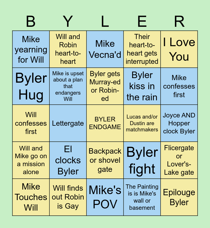 This bingo card has a free space and 24 words: Mike Touches Will, El clocks Byler, Byler gets Murray-ed or Robin-ed, The Painting is is Mike's wall or basement, I Love You, Mike yearning for Will, Will and Robin heart-to-heart, Mike Vecna'd, Lucas and/or Dustin are matchmakers, Joyce AND Hopper clock Byler, Will confesses first, Mike is upset about a plan that endangers Will, Byler fight, Flicergate or Lover's-Lake gate, Byler Hug, Will finds out Robin is Gay, Mike's POV, Their heart-to-heart gets interrupted, Mike confesses first, Will and Mike go on a mission alone, Lettergate, Backpack or shovel gate, Byler kiss in the rain and Epilouge Byler.