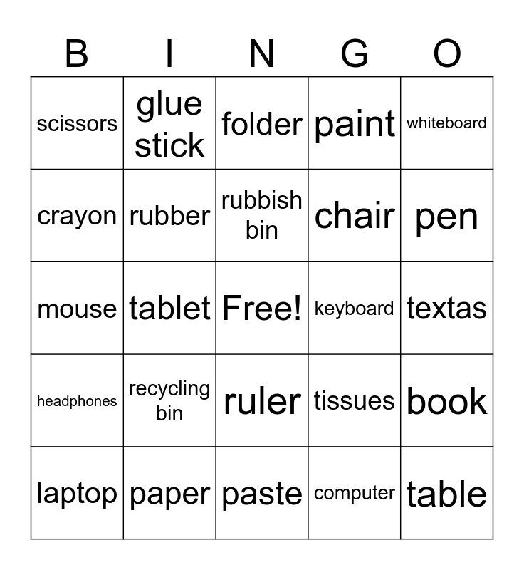 This bingo card has a free space and 28 words: book, brush, chair, computer, crayon, folder, glue stick, headphones, keyboard, laptop, mouse, paint, paper, paste, pen, pencil, recycling bin, rubber, rubbish bin, ruler, scissors, sharpener, table, tablet, textas, tissues, whiteboard and whiteboard marker.