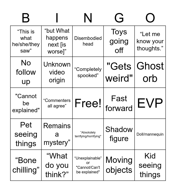 This bingo card has a free space and 24 words: Remains a mystery”, “What do you think?”, “Completely spooked”, “Bone chilling”, “Let me know your thoughts.”, “This is what he/she/they saw”, No follow up, “but What happens next [is worse]”, Fast forward, “Absolutely terrifying/horrifying", "Gets weird", "Cannot be explained", Shadow figure, Doll/mannequin, Unknown video origin, Moving objects, EVP, Disembodied head, Ghost orb, “Commenters all agree”, Kid seeing things, Pet seeing things, Toys going off and “Unexplainable” or "Cannot/Can't be explained".