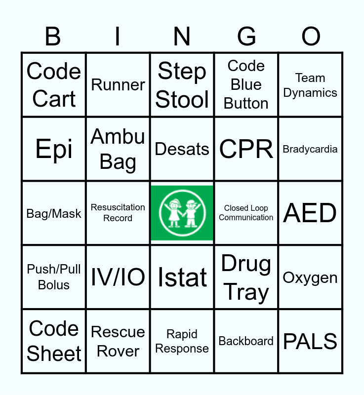 This bingo card has a free space and 26 words: Istat, Backboard, Desats, Rescue Rover, Team Dynamics, Code Cart, Epi, Runner, AED, Drug Tray, CPR, Bag/Mask, Oxygen, Code Sheet, Resuscitation Record, Suction, Code Blue Button, Push/Pull Bolus, Step Stool, PALS, Bradycardia, Rapid Response, Closed Loop Communication, IV/IO, Ambu Bag and Respiratory Roll.