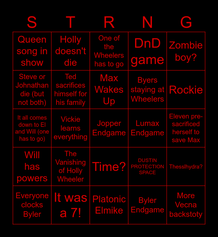 This bingo card has 25 words: The Vanishing of Holly Wheeler, Platonic Elmike, Max Wakes Up, Everyone clocks Byler, Zombie boy?, Queen song in show, Steve or Johnathan die (but not both), Holly doesn't die, Lumax Endgame, Time?, Byers staying at Wheelers, It all comes down to El and Will (one has to go), DUSTIN PROTECTION SPACE, Thesslhydra?, Ted sacrifices himself for his family, More Vecna backstoty, Eleven pre-sacrificed herself to save Max, One of the Wheelers has to go, Rockie, Vickie learns everything, Jopper Endgame, It was a 7!, Will has powers, DnD game and Byler Endgame.
