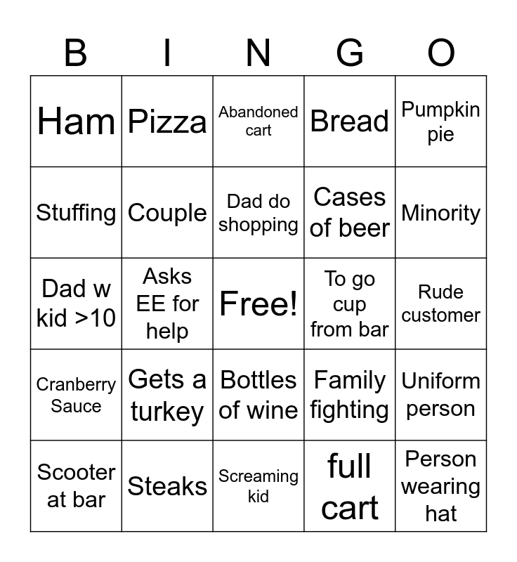 This bingo card has a free space and 25 words: Gets a turkey, Screaming kid, Dad do shopping, Scooter at bar, Pumpkin pie, Ham, Stuffing, Pizza, To go cup from bar, Bottles of wine, Cases of beer, Dad w kid >10, Family fighting, Uniform person, Couple, Drunks at bar, Rude customer, Abandoned cart, Minority, Asks EE for help, Person wearing hat, Steaks, Cranberry Sauce, Bread and full cart.