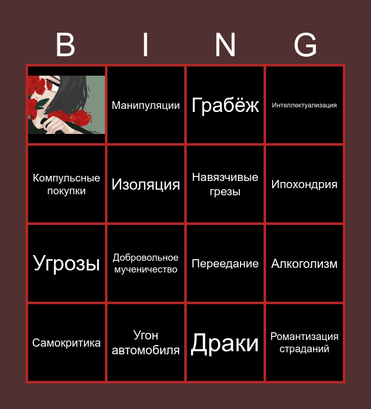 This bingo card has 1 images and 15 words: Угон автомобиля, Алкоголизм, Грабёж, Угрозы, Манипуляции, Переедание, Драки, Компульсные покупки, Изоляция, Самокритика, Интеллектуализация, Добровольное мученичество, Ипохондрия, Навязчивые грезы and Романтизация страданий.