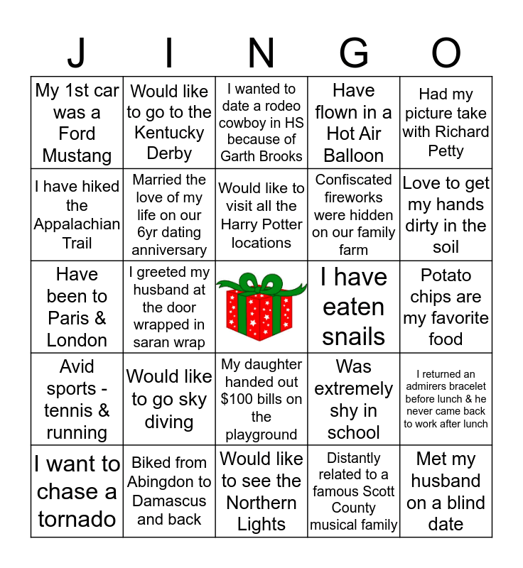 This bingo card has a free space and 24 words: Would like to go sky diving, Biked from Abingdon to Damascus and back, Would like to visit all the Harry Potter locations, I want to chase a tornado, Had my picture take with Richard Petty, My 1st car was a Ford Mustang, I have hiked the Appalachian Trail, Would like to go to the Kentucky Derby, I have eaten snails, My daughter handed out $100 bills on the playground, Confiscated fireworks were hidden on our family farm, Have been to Paris & London, Was extremely shy in school, I returned an admirers bracelet before lunch & he never came back to work after lunch, Married the love of my life on our 6yr dating anniversary, Distantly related to a famous Scott County musical family, Potato chips are my favorite food, I wanted to date a rodeo cowboy in HS because of Garth Brooks, Love to get my hands dirty in the soil, I greeted my husband at the door wrapped in saran wrap, Met my husband on a blind date, Avid sports - tennis & running, Have flown in a Hot Air Balloon and Would like to see the Northern Lights.
