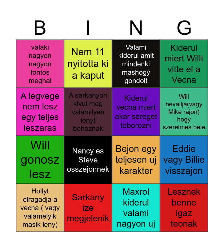 This bingo card has 16 words: Sarkany ize megjelenik, Eddie vagy Billie visszajon, Valami kiderul amit mindenki mashogy gondolt, valaki nagyon nagyon fontos meghal, Will gonosz lesz, Nem 11 nyitotta ki a kaput, Bejon egy teljesen uj karakter, Maxrol kiderul valami nagyon uj, A legvege nem lesz egy teljes leszaras, A sarkanyon kivul meg valamilyen lenyt behoznak, Hollyt elragadja a vecna ( vagy valamelyik masik leny), Kiderul miert Willt vitte el a Vecna, Nancy es Steve osszejonnek, Will bevallja(vagy Mike rajon) hogy szerelmes bele, Kiderul vecna miert akar sereget toborozni and Lesznek benne igaz teoriak.