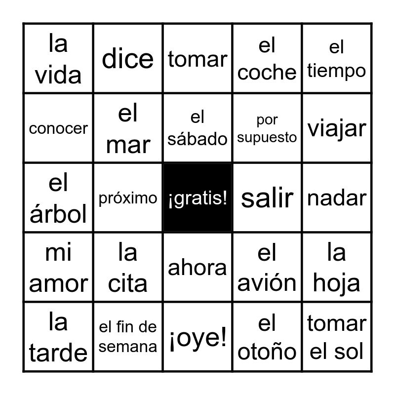 This bingo card has a free space and 24 words: la cita, el fin de semana, el sábado, la tarde, el tiempo, la vida, conocer, dice, salir, ahora, por supuesto, el árbol, el avión, la hoja, el mar, el otoño, nadar, tomar, viajar, próximo, tomar el sol, mi amor, el coche and ¡oye!.