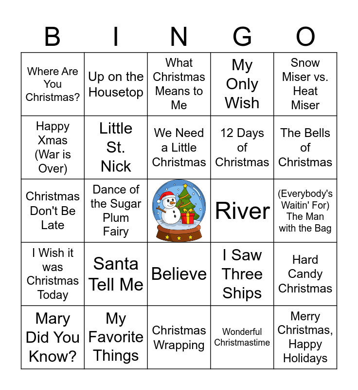 This bingo card has a free space and 39 words: Do You Hear What I Hear?, Silver and Gold, Christmas (Baby Please Come Home), Little St. Nick, Mary Did You Know?, Believe, We Need a Little Christmas, The Hanukkah Song, Snow Miser vs. Heat Miser, I Wish it was Christmas Today, Dance of the Sugar Plum Fairy, My Only Wish, Merry Christmas, Happy Holidays, (Everybody's Waitin' For) The Man with the Bag, River, Santa Tell Me, O Christmas Tree, Where Are You Christmas?, Someday at Christmas, I Saw Three Ships, Happy Xmas (War is Over), Christmas Wrapping, 12 Days of Christmas, The Bells of Christmas, Santa Claus is Coming to Town, Baby It's Cold Outside, No. 2 March, When Christmas Comes to Town, Please Come Home for Christmas, Up on the Housetop, We're a Couple of Misfits, This Christmas, What Christmas Means to Me, My Favorite Things, Wonderful Christmastime, Peace on Earth/Little Drummer Boy, Hard Candy Christmas, Christmas Don't Be Late and I'm Gettin' Nuttin' for Christmas.