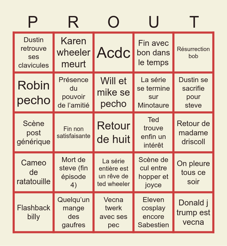 This bingo card has a free space and 24 words: Mort de steve (fin épisode 4), Quelqu’un mange des gaufres, Will et mike se pecho, Flashback billy, Résurrection bob, Dustin retrouve ses clavicules, Robin pecho, Karen wheeler meurt, Ted trouve enfin un intérêt, La série entière est un rêve de ted wheeler, La série se termine sur Minotaure, Scène post générique, Scène de cul entre hopper et joyce, On pleure tous ce soir, Présence du pouvoir de l’amitié, Eleven cosplay encore Sabestien, Retour de madame driscoll, Acdc, Dustin se sacrifie pour steve, Fin non satisfaisante, Donald j trump est vecna, Cameo de ratatouille, Fin avec bon dans le temps and Vecna twerk avec ses pec.