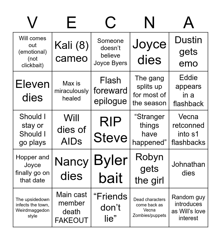 This bingo card has a free space and 31 words: “Friends don’t lie”, “Bad” by Micheal Jackson, Will dies of AIDs, The Power of Friendship, Will comes out (emotional) (not clickbait), Someone doesn’t believe Joyce Byers, Max is miraculously healed, Robyn gets the girl, “Stranger things have happened”, Dead characters come back as Vecna Zombies/puppets, Vecna retconned into s1 flashbacks, Random guy introduces as Will’s love interest, Mike and El break up, Steddie Bait, Eddie appears in a flashback, Karen Wheeler badass moment, Johnathan dies, Nancy dies, Hopper and Joyce finally go on that date, Byler bait, Dustin gets emo, We meet Steve’s dad and he sucks, The upsidedown infects the town, Weirdmaggedon style, Kali (8) cameo, The gang splits up for most of the season, Eleven dies, Joyce dies, Should I stay or Should I go plays, Main cast member death FAKEOUT, Flash foreward epilogue and Stancy :(.