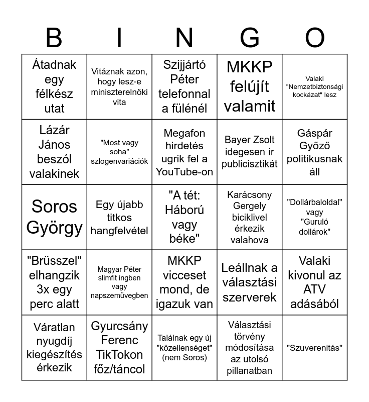 This bingo card has a free space and 24 words: Magyar Péter slimfit ingben vagy napszemüvegben, Gyurcsány Ferenc TikTokon főz/táncol, Megafon hirdetés ugrik fel a YouTube-on, Váratlan nyugdíj kiegészítés érkezik, Valaki "Nemzetbiztonsági kockázat" lesz, Átadnak egy félkész utat, Lázár János beszól valakinek, Vitáznak azon, hogy lesz-e miniszterelnöki vita, Karácsony Gergely biciklivel érkezik valahova, MKKP vicceset mond, de igazuk van, Bayer Zsolt idegesen ír publicisztikát, Soros György, Leállnak a választási szerverek, Valaki kivonul az ATV adásából, "Most vagy soha" szlogenvariációk, Választási törvény módosítása az utolsó pillanatban, "Dollárbaloldal" vagy "Guruló dollárok", Szijjártó Péter telefonnal a fülénél, Gáspár Győző politikusnak áll, Egy újabb titkos hangfelvétel, "Szuverenitás", "Brüsszel" elhangzik 3x egy perc alatt, MKKP felújít valamit and Találnak egy új "közellenséget" (nem Soros).