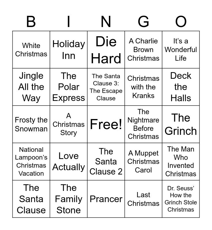 This bingo card has a free space and 39 words: Home Alone, Home Alone 2: Lost in New York, Elf, The Polar Express, The Santa Clause, The Santa Clause 2, The Santa Clause 3: The Escape Clause, Miracle on 34th Street, It’s a Wonderful Life, National Lampoon’s Christmas Vacation, A Christmas Story, A Charlie Brown Christmas, Dr. Seuss’ How the Grinch Stole Christmas, The Grinch, The Nightmare Before Christmas, Love Actually, The Holiday, White Christmas, Scrooged, A Muppet Christmas Carol, Jingle All the Way, Prancer, Christmas with the Kranks, Deck the Halls, Arthur Christmas, Klaus, The Christmas Chronicles, Four Christmases, Fred Claus, Holiday Inn, Meet Me in St. Louis, The Shop Around the Corner, Die Hard, The Family Stone, Last Christmas, Noelle, The Man Who Invented Christmas, Frosty the Snowman and Rudolph the Red-Nosed Reindeer.
