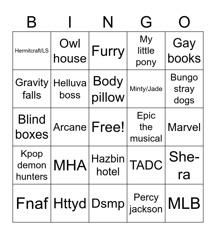 This bingo card has a free space and 24 words: MHA, Httyd, Body pillow, Fnaf, Gay books, Hermitcraft/LS, Gravity falls, Owl house, Epic the musical, Hazbin hotel, Minty/Jade, Blind boxes, TADC, She-ra, Helluva boss, Percy jackson, Marvel, Furry, Bungo stray dogs, Arcane, MLB, Kpop demon hunters, My little pony and Dsmp.