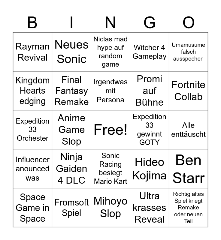 This bingo card has a free space and 24 words: Ninja Gaiden 4 DLC, Fromsoft Spiel, Irgendwas mit Persona, Space Game in Space, Umamusume falsch ausspechen, Rayman Revival, Kingdom Hearts edging, Neues Sonic, Expedition 33 gewinnt GOTY, Sonic Racing besiegt Mario Kart, Promi auf Bühne, Expedition 33 Orchester, Hideo Kojima, Ben Starr, Final Fantasy Remake, Ultra krasses Reveal, Alle enttäuscht, Niclas mad hype auf random game, Fortnite Collab, Anime Game Slop, Richtig altes Spiel kriegt Remake oder neuen Teil, Influencer anounced was, Witcher 4 Gameplay and Mihoyo Slop.