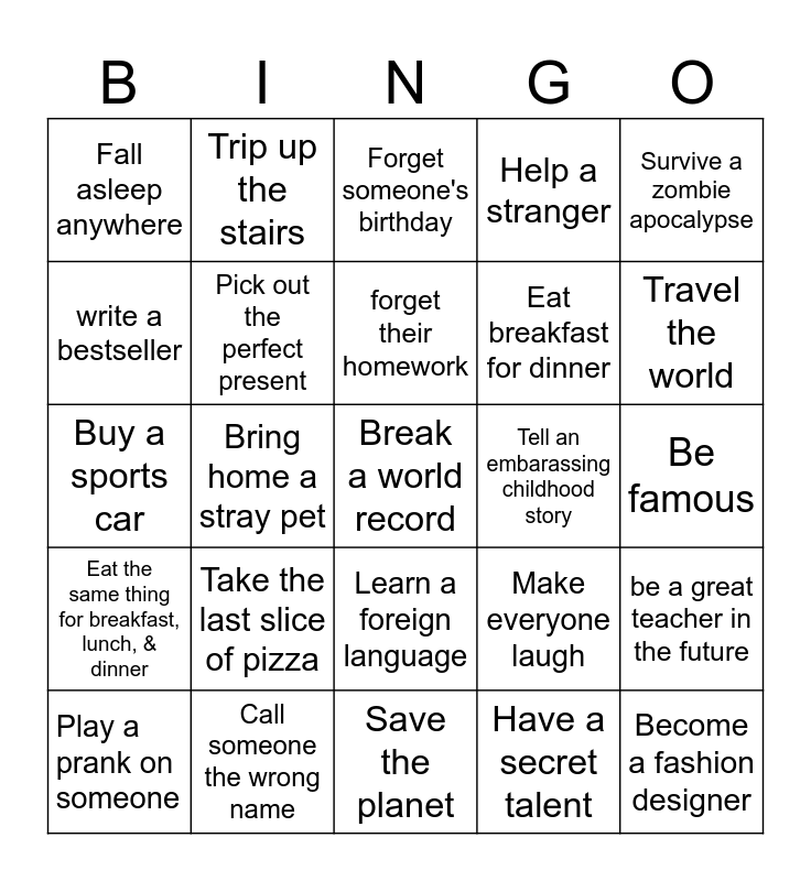 This bingo card has 29 words: Play a prank on someone, Have a messy room, Bring home a stray pet, Become a fashion designer, Fall asleep anywhere, Forget someone's birthday, Pick out the perfect present, Take the last slice of pizza, Tell an embarassing childhood story, Call someone the wrong name, Be famous, Break a world record, Save the planet, Have a secret talent, Travel the world, Start their own business, Learn a foreign language, Eat the same thing for breakfast, lunch, & dinner, Survive a zombie apocalypse, Buy a sports car, Make everyone laugh, Be athletic, Eat breakfast for dinner, write a bestseller, Help a stranger, Trip up the stairs, be a great teacher in the future, forget their homework and become a fashion designer.