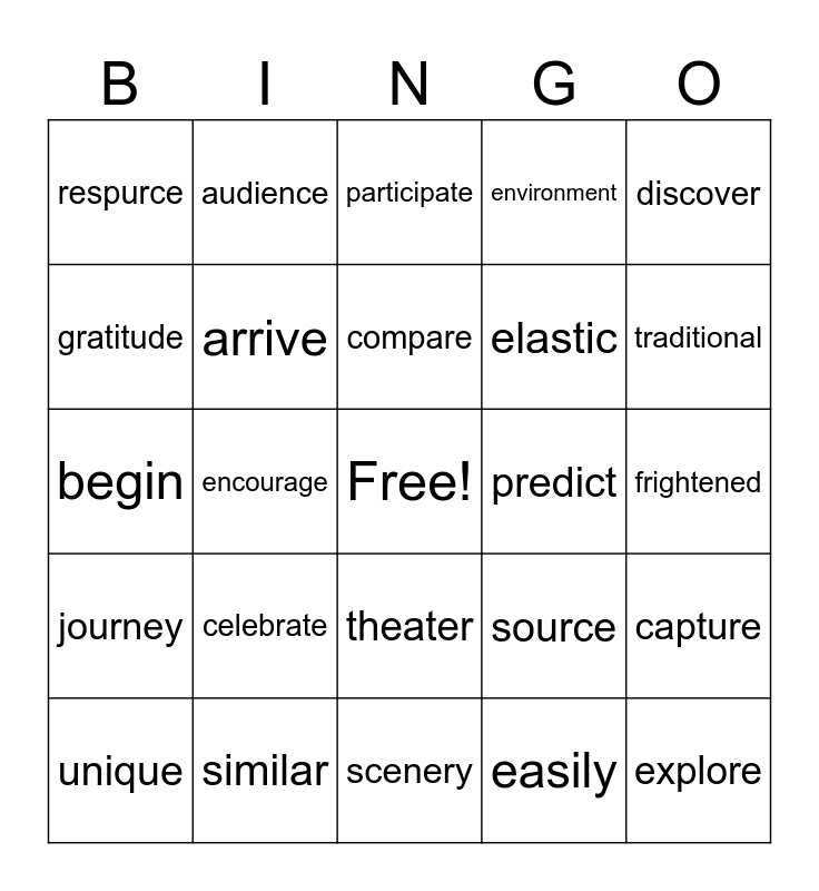 This bingo card has a free space and 38 words: abundant, adventure, ancient, arrive, capture, celebrate, compare, dangerous, discover, elastic, encourage, environment, explore, frightened, gratitude, journey, knowledge, participate, pleasant, predict, respurce, similar, traditional, unique, volunteer, scenery, you're, creating, rehersal, interesting, staging, theater, easily, audience, ancient, source, begin and different.