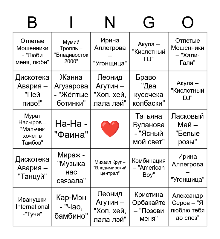 This bingo card has a free space and 29 words: Иванушки International -"Тучи", Руки Вверх! - "Крошка моя", На-На - "Фаина", Андрей Губин - "Зима-холода", Отпетые Мошенники - "Люби меня, люби", Ирина Аллегрова – "Угонщица", Жанна Агузарова - "Жёлтые ботинки", Мираж - "Музыка нас связала", Татьяна Буланова - "Ясный мой свет", Кар-Мэн - "Чао, бамбино", Ласковый Май – "Белые розы", Александр Серов – "Я люблю тебя до слез", Леонид Агутин – "Хоп, хей, лала лэй", Кристина Орбакайте – "Позови меня", Акула – "Кислотный DJ", Мумий Тролль – "Владивосток 2000", Михаил Круг – "Владимирский централ", Дискотека Авария – "Танцуй", Отпетые Мошенники – "Хали-Гали", Мурат Насыров – "Мальчик хочет в Тамбов", Комбинация – "American Boy", ЧайФ – "Аргентина — Ямайка 5:0", Браво – "Два кусочека колбаски", Дискотека Авария – "Пей пиво!", Акула – "Кислотный DJ", Мумий Тролль – "Владивосток 2000", Ирина Аллегрова – "Угонщица", Леонид Агутин – "Хоп, хей, лала лэй" and Дискотека Авария – "Танцуй".