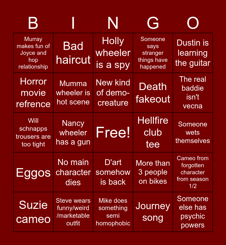 This bingo card has a free space and 24 words: No main character dies, Steve wears funny/weird /marketable outfit, New kind of demo-creature, Suzie cameo, Dustin is learning the guitar, Murray makes fun of Joyce and hop relationship, Horror movie refrence, Bad haircut, Hellfire club tee, D'art somehow is back, Death fakeout, Will schnapps trousers are too tight, More than 3 people on bikes, Cameo from forgotten character from season 1/2, Mumma wheeler is hot scene, Journey song, Someone wets themselves, Holly wheeler is a spy, The real baddie isn't vecna, Nancy wheeler has a gun, Someone else has psychic powers, Eggos, Someone says stranger things have happened and Mike does something semi homophobic.
