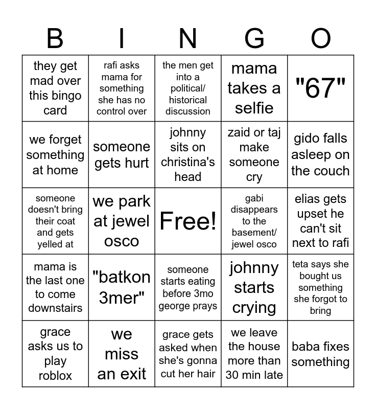 This bingo card has a free space and 24 words: "batkon 3mer", we miss an exit, johnny sits on christina's head, grace asks us to play roblox, "67", they get mad over this bingo card, we forget something at home, rafi asks mama for something she has no control over, gabi disappears to the basement/ jewel osco, someone starts eating before 3mo george prays, zaid or taj make someone cry, someone doesn't bring their coat and gets yelled at, johnny starts crying, teta says she bought us something she forgot to bring, someone gets hurt, we leave the house more than 30 min late, elias gets upset he can't sit next to rafi, the men get into a political/ historical discussion, gido falls asleep on the couch, we park at jewel osco, baba fixes something, mama is the last one to come downstairs, mama takes a selfie and grace gets asked when she's gonna cut her hair.
