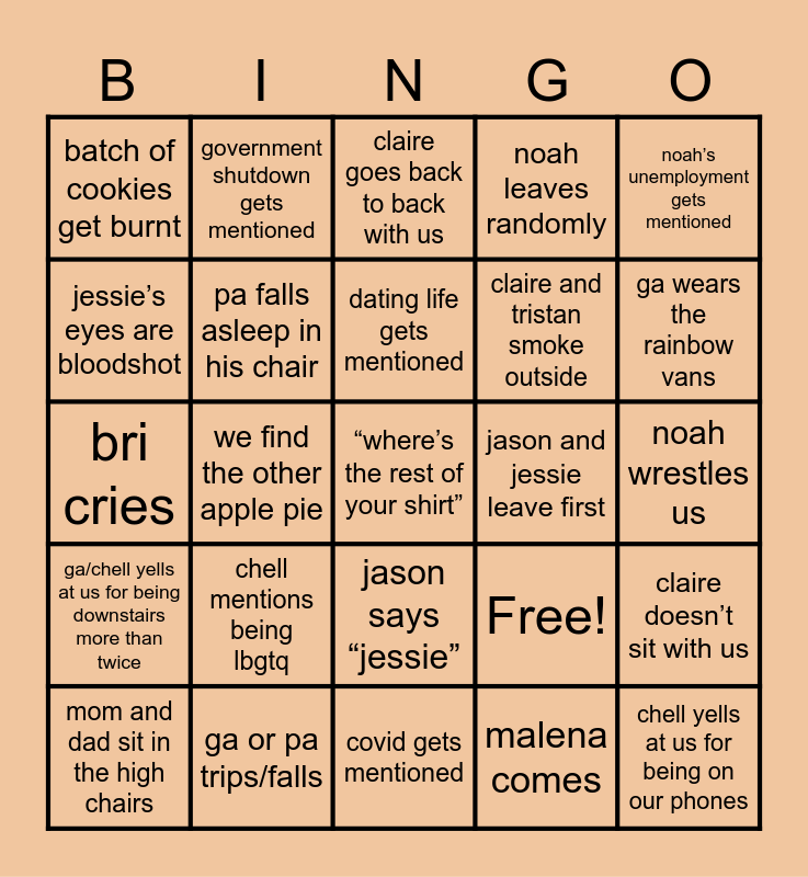 This bingo card has 25 words: chell mentions being lbgtq, covid gets mentioned, dating life gets mentioned, mom and dad sit in the high chairs, noah’s unemployment gets mentioned, batch of cookies get burnt, jessie’s eyes are bloodshot, government shutdown gets mentioned, jason and jessie leave first, jason says “jessie”, claire and tristan smoke outside, bri cries, Free!, claire doesn’t sit with us, pa falls asleep in his chair, chell yells at us for being on our phones, noah wrestles us, claire goes back to back with us, ga wears the rainbow vans, we find the other apple pie, “where’s the rest of your shirt”, ga or pa trips/falls, ga/chell yells at us for being downstairs more than twice, noah leaves randomly and malena comes.