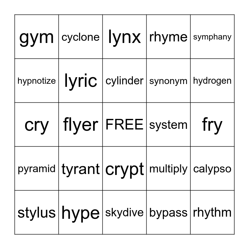 This bingo card has a free space and 24 words: tyrant, hype, cylinder, stylus, symphany, gym, hypnotize, cyclone, system, crypt, synonym, cry, multiply, calypso, lyric, bypass, fry, lynx, hydrogen, flyer, rhythm, pyramid, rhyme and skydive.
