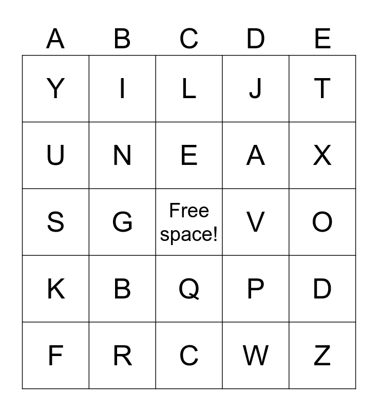 This bingo card has a free space and 26 words: Q, W, E, R, T, Y, U, I, O, P, A, S, D, F, G, H, J, K, L, Z, X, C, V, B, N and M.