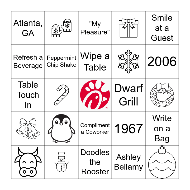 This bingo card has 16 images, a free space and 20 words: Table Touch In, Doodles the Rooster, Dwarf Grill, 2006, Atlanta, GA, Wipe a Table, 1967, Truett S. Cathy, Tortilla Soup, Peppermint Chip Shake, "My Pleasure", 165°, Smile at a Guest, Refresh a Beverage, Clean 1 Item, Compliment a Coworker, Ashley Bellamy, Write on a Bag, Lend a Helping Hand and Surprise & Delight.