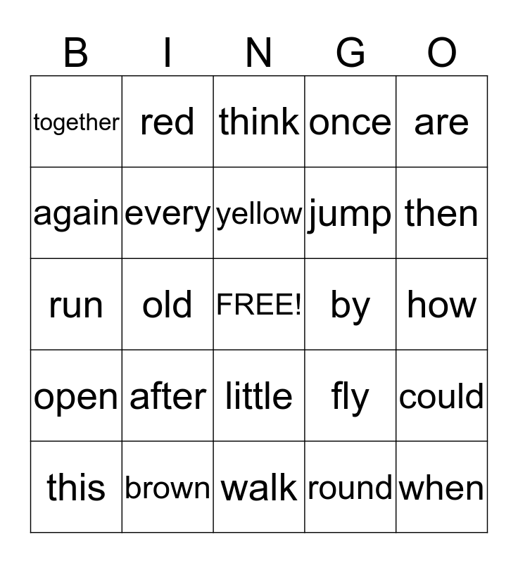 This bingo card has a free space and 24 words: after, brown, yellow, this, are, together, again, red, by, little, jump, run, fly, could, every, round, how, think, then, old, when, open, once and walk.