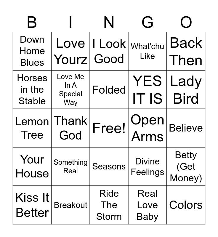 This bingo card has a free space and 30 words: Breakout, Te Amo, Thank God, Rockit, Down Home Blues, I Look Good, Love Me In A Special Way, Seasons, Open Arms, Ride The Storm, Believe, Colors, Real Love Baby, Baby Bay, Lady Bird, The Fate of Ophelia, Divine Feelings, Your House, Something Real, Back Then, Lemon Tree, Pink Pony Club, Love Yourz, YES IT IS, Horses in the Stable, What'chu Like, Betty (Get Money), Kiss It Better, Folded and Give Me Mercy.
