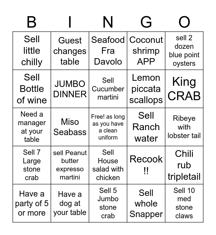 This bingo card has a free space and 24 words: sell Peanut butter expresso martini, Have a dog at your table, Sell Cucumber martini, Have a party of 5 or more, sell 2 dozen blue point oysters, Sell little chilly, Sell Bottle of wine, Guest changes table, Sell Ranch water, Sell House salad with chicken, Lemon piccata scallops, Need a manager at your table, Recook !!, Chili rub tripletail, JUMBO DINNER, Sell whole Snapper, Ribeye with lobster tail, Seafood Fra Davolo, King CRAB, Miso Seabass, Sell 10 med stone claws, Sell 7 Large stone crab, Coconut shrimp APP and Sell 5 Jumbo stone crab.