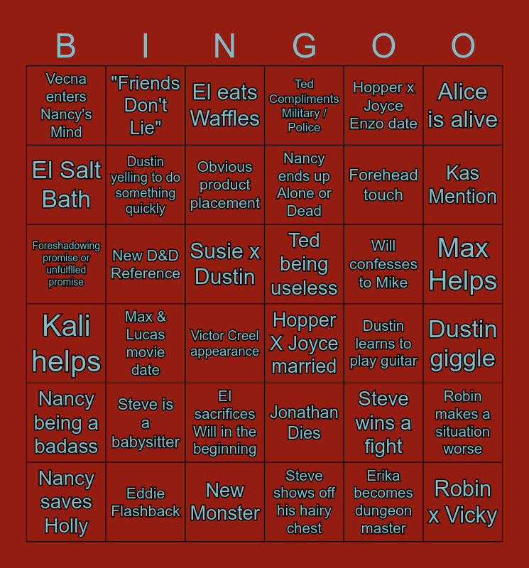 This bingo card has 36 words: Jonathan Dies, EI sacrifices Will in the beginning, Steve shows off his hairy chest, El Salt Bath, Kali helps, Ted being useless, Dustin yelling to do something quickly, New Monster, Hopper x Joyce Enzo date, Steve wins a fight, Kas Mention, Ted Compliments Military / Police, Robin makes a situation worse, New D&D Reference, Nancy ends up Alone or Dead, Vecna enters Nancy's Mind, Nancy being a badass, Will confesses to Mike, Foreshadowing promise or unfulflled promise, El eats Waffles, Susie x Dustin, Max & Lucas movie date, Hopper X Joyce married, Victor Creel appearance, Dustin learns to play guitar, "Friends Don't Lie", Forehead touch, Eddie Flashback, Obvious product placement, Alice is alive, Robin x Vicky, Nancy saves Holly, Dustin giggle, Max Helps, Steve is a babysitter and Erika becomes dungeon master.
