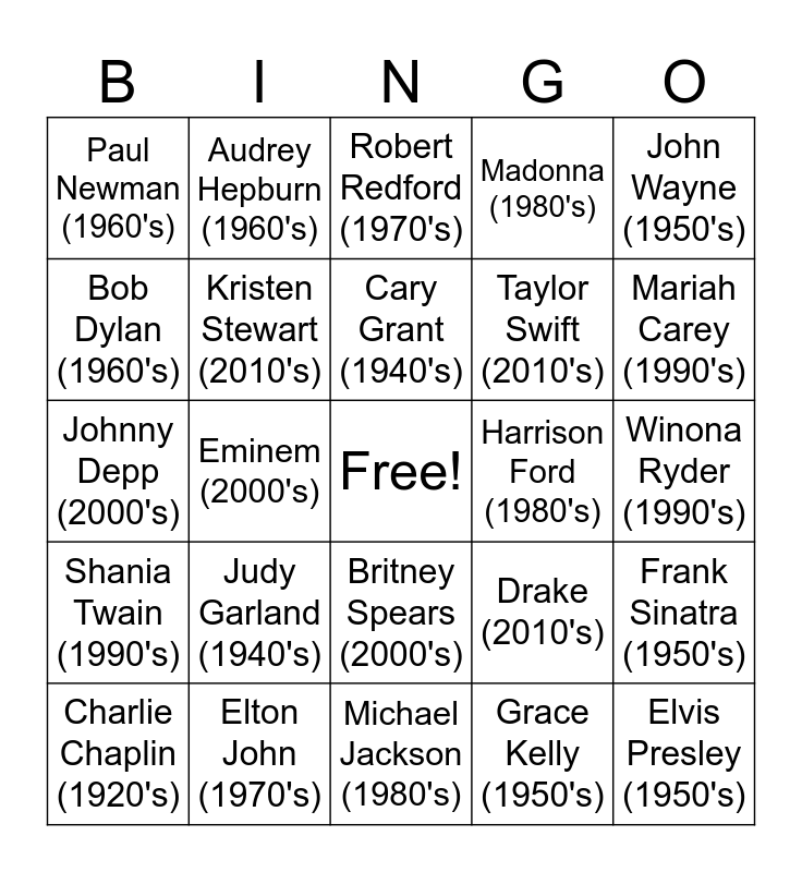 This bingo card has a free space and 24 words: Charlie Chaplin (1920's), Judy Garland (1940's), Cary Grant (1940's), Grace Kelly (1950's), John Wayne (1950's), Paul Newman (1960's), Audrey Hepburn (1960's), Robert Redford (1970's), Harrison Ford (1980's), Winona Ryder (1990's), Johnny Depp (2000's), Kristen Stewart (2010's), Drake (2010's), Frank Sinatra (1950's), Bob Dylan (1960's), Elton John (1970's), Michael Jackson (1980's), Madonna (1980's), Mariah Carey (1990's), Shania Twain (1990's), Eminem (2000's), Britney Spears (2000's), Taylor Swift (2010's) and Elvis Presley (1950's).