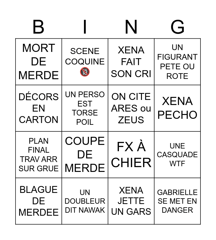 This bingo card has 16 words: UN DOUBLEUR DIT NAWAK, UNE CASQUADE WTF, XENA FAIT SON CRI, MORT DE MERDE, PLAN FINAL TRAV ARR SUR GRUE, SCENE COQUINE 🔞, FX À CHIER, XENA JETTE UN GARS, DÉCORS EN CARTON, UN PERSO EST TORSE POIL, BLAGUE DE MERDEE, UN FIGURANT PETE OU ROTE, COUPE DE MERDE, XENA PECHO, ON CITE ARES ou ZEUS and GABRIELLE SE MET EN DANGER.