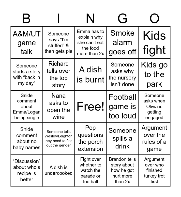This bingo card has a free space and 24 words: Someone tells Wesley/Leighton they need to find out the gender, A dish is undercooked, A dish is burnt, “Discussion” about who’s recipe is better, Kids fight, A&M/UT game talk, Someone starts a story with “back in my day”, Someone says “I’m stuffed” & then gets pie, Football game is too loud, Pop questions the porch extension, Someone asks why the nursery isn’t done, Snide comment about Emma/Logan being single, Someone spills a drink, Argument over the rules of a game, Richard tells over the top story, Brandon tells story about how he got hurt more than 2x, Someone asks when Olivia is getting engaged, Emma has to explain why she can’t eat the food more than 2x, Kids go to the park, Nana asks to open the wine, Argument over who finished turkey trot first, Snide comment about no baby names, Smoke alarm goes off and Fight over whether to watch the parade or football.