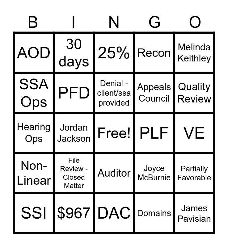 This bingo card has a free space and 55 words: T2, SSI, DLI, AOD, DAC, DWB, PFD, USDC, Appeals Council, Application, Recon, SGA, VA, ALJ, CW Hadley, Calyn Hambleton, Melinda Keithley, Jordan Jackson, Felicia Von Holten, James Pavisian, PLF, Kelsey Young, Joyce McBurnie, 25%, $9200, Denial - client/ssa provided, Domains, Consultative Exam, VE, Partially Favorable, Unfavorable, Favorable, POD, Intakes, SSA Ops, Hearing Ops, Disability Rating, Non-Linear, Kylee Stockton, 60 days, 30 days, Remand, SOP, 8223, File Review - Closed Matter, $967, 1696, HSA Team, Hearing, Quality Review, Client Services, Intake Team, OA Team, Auditor and VA Paralegal.