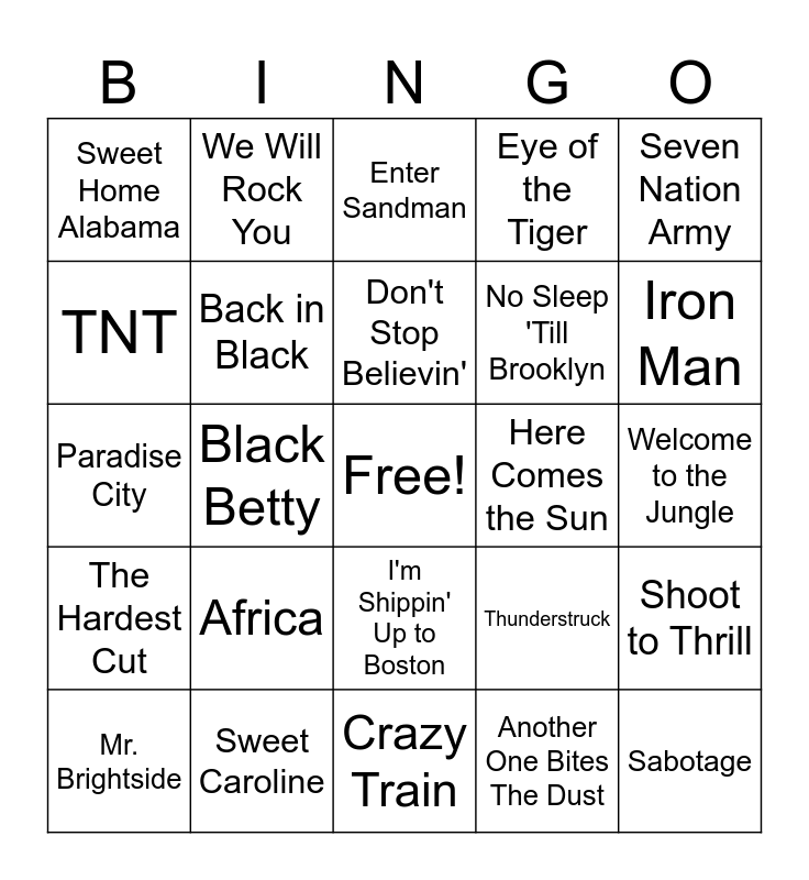 This bingo card has a free space and 24 words: Mr. Brightside, Africa, Don't Stop Believin', Another One Bites The Dust, Seven Nation Army, Sweet Home Alabama, We Will Rock You, Enter Sandman, Here Comes the Sun, Welcome to the Jungle, Paradise City, Back in Black, Thunderstruck, Shoot to Thrill, TNT, Sweet Caroline, Crazy Train, Eye of the Tiger, Iron Man, The Hardest Cut, Black Betty, I'm Shippin' Up to Boston, No Sleep 'Till Brooklyn and Sabotage.