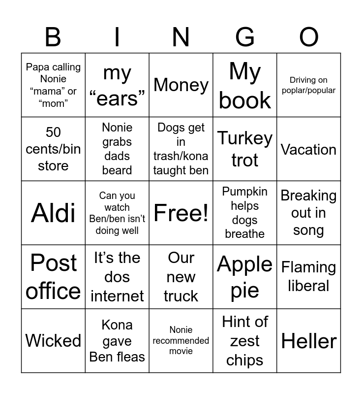 This bingo card has a free space and 24 words: It’s the dos internet, Kona gave Ben fleas, Dogs get in trash/kona taught ben, Wicked, Driving on poplar/popular, Papa calling Nonie “mama” or “mom”, 50 cents/bin store, my “ears”, Pumpkin helps dogs breathe, Our new truck, Turkey trot, Aldi, Apple pie, Flaming liberal, Nonie grabs dads beard, Hint of zest chips, Breaking out in song, Money, Vacation, Can you watch Ben/ben isn’t doing well, Heller, Post office, My book and Nonie recommended movie.
