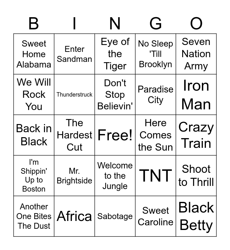 This bingo card has a free space and 24 words: Mr. Brightside, Africa, Don't Stop Believin', Another One Bites The Dust, Seven Nation Army, Sweet Home Alabama, We Will Rock You, Enter Sandman, Here Comes the Sun, Welcome to the Jungle, Paradise City, Back in Black, TNT, Shoot to Thrill, Thunderstruck, Sweet Caroline, Crazy Train, Eye of the Tiger, Iron Man, The Hardest Cut, Black Betty, I'm Shippin' Up to Boston, No Sleep 'Till Brooklyn and Sabotage.