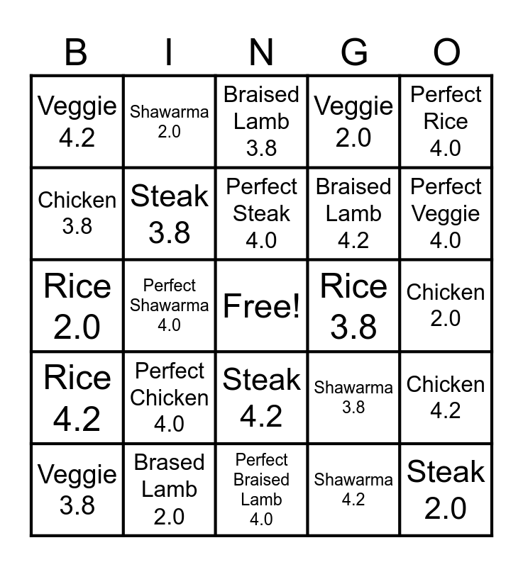 This bingo card has a free space and 24 words: Perfect Chicken 4.0, Brased Lamb 2.0, Perfect Steak 4.0, Veggie 3.8, Perfect Rice 4.0, Veggie 4.2, Chicken 3.8, Shawarma 2.0, Rice 3.8, Steak 4.2, Braised Lamb 4.2, Rice 2.0, Shawarma 3.8, Chicken 4.2, Steak 3.8, Shawarma 4.2, Chicken 2.0, Braised Lamb 3.8, Perfect Veggie 4.0, Perfect Shawarma 4.0, Steak 2.0, Rice 4.2, Veggie 2.0 and Perfect Braised Lamb 4.0.