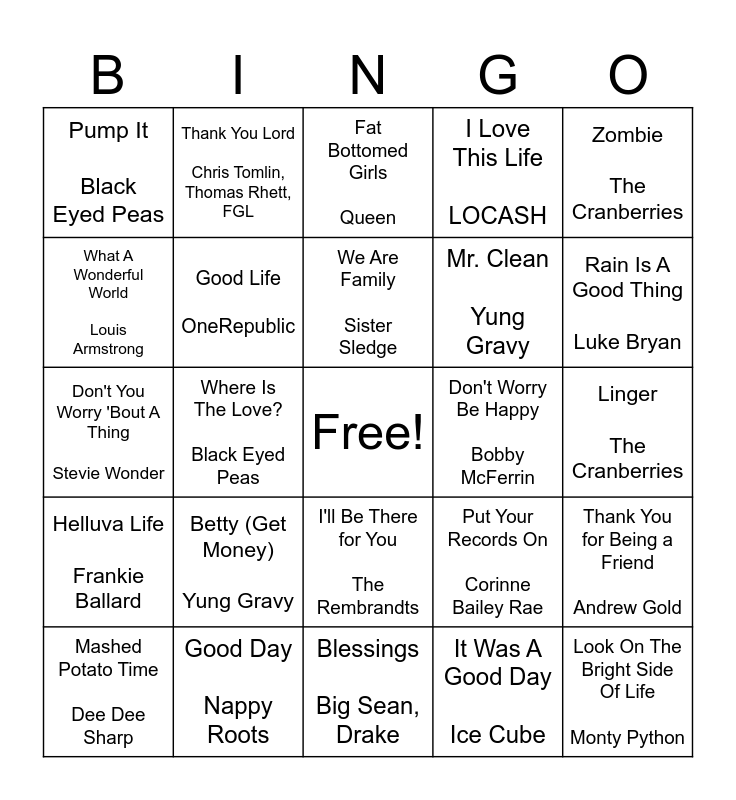 This bingo card has a free space and 63 words: thank u, next Ariana Grande, Thank God I'm A Country Boy John Denver, Thnks fr th Mmrs Fall Out Boy, Thank You for Being a Friend Andrew Gold, Thank You Dido, GREENS BEANS POTATOES DJ Suede The Remix God, Thank You Lord Chris Tomlin, Thomas Rhett, FGL, Family Tradition Hank Williams, Jr., We Are Family Sister Sledge, You've Got a Friend in Me Randy Newman, I'll Be There for You The Rembrandts, Friends Justin Bieber, Linger The Cranberries, Zombie The Cranberries, It's A Great Day To Be Alive Travis Tritt, What A Wonderful World Louis Armstrong, Where Is The Love? Black Eyed Peas, Pump It Black Eyed Peas, Let's Get It Started Black Eyed Peas, Mr. Clean Yung Gravy, Betty (Get Money) Yung Gravy, Helluva Life Frankie Ballard, I Love This Life LOCASH, Simple FGL, Bless The Broken Road Rascal Flatts, God Gave Me You Blake Shelton, Little Bitty Alan Jackson, I Love My Country FGL, This Bar Morgan Wallen, Good Beer Seaforth, Jordan Davis, I'm Alright Jo Dee Messina, Cold Beer & Country Music Zach Top, Travelin' Soldier Cody Johnson, I Can't Help Myself (Sugar Pie, Honey Bunch) Four Tops, Rain Is A Good Thing Luke Bryan, Mashed Potato Time Dee Dee Sharp, (Do The) Mashed Potatoes James Brown, It Was A Good Day Ice Cube, I Love a Rainy Night Eddie Rabbitt, Good Life OneRepublic, Don't You Worry 'Bout A Thing Stevie Wonder, Don't Worry Be Happy Bobby McFerrin, Lovely Day Bill Withers, My Favorite Things Julie Andrews, Look On The Bright Side Of Life Monty Python, Good Day Nappy Roots, If You Want To Sing Out, Sing Out Cat Stevens, Put Your Records On Corinne Bailey Rae, Walking On Sunshine Katrina & The Waves, I Hope You Dance Lee Ann Womack, Thank You Love Stevie Wonder, Blessings Big Sean, Drake, Blessings Chance the Rapper, In My Life The Beatles, Thanksgiving Theme Vince Guaraldi Trio, Fat Bottomed Girls Queen, Red Red Wine UB40, (What A) Wonderful World Sam Cooke, Cherry Pie Warrant, Spirit in the Sky Norman Greenbaum, Thank You Sly & The Family Stone, Mr. Roboto Styx and Good Life Kanye West, T-Pain.