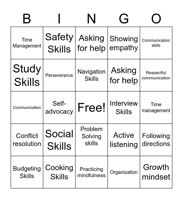 This bingo card has a free space and 24 words: Social Skills, Cooking Skills, Navigation Skills, Budgeting Skills, Communication skills, Time Management, Study Skills, Safety Skills, Interview Skills, Problem Solving skills, Asking for help, Communication, Active listening, Following directions, Perseverance, Organization, Time management, Asking for help, Respectful communication, Self-advocacy, Growth mindset, Conflict resolution, Showing empathy and Practicing mindfulness.