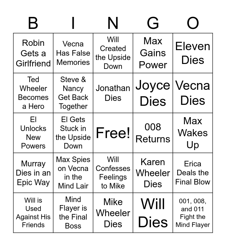This bingo card has a free space and 24 words: Max Spies on Vecna in the Mind Lair, Mind Flayer is the Final Boss, Jonathan Dies, Will is Used Against His Friends, Eleven Dies, Robin Gets a Girlfriend, Ted Wheeler Becomes a Hero, Vecna Has False Memories, 008 Returns, Will Confesses Feelings to Mike, Joyce Dies, El Unlocks New Powers, Karen Wheeler Dies, Erica Deals the Final Blow, Steve & Nancy Get Back Together, Will Dies, Max Wakes Up, Will Created the Upside Down, Vecna Dies, El Gets Stuck in the Upside Down, 001, 008, and 011 Fight the Mind Flayer, Murray Dies in an Epic Way, Max Gains Power and Mike Wheeler Dies.