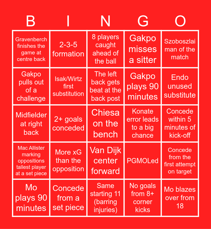 This bingo card has a free space and 24 words: More xG than the opposition, Concede from a set piece, The left back gets beat at the back post, Mo plays 90 minutes, Szoboszlai man of the match, Gravenberch finishes the game at centre back, Gakpo pulls out of a challenge, 2-3-5 formation, Konate error leads to a big chance, Van Dijk center forward, Gakpo plays 90 minutes, Midfielder at right back, PGMOLed, Concede from the first attempt on target, Isak/Wirtz first substitution, No goals from 8+ corner kicks, Concede within 5 minutes of kick-off, 8 players caught ahead of the ball, Endo unused substitute, 2+ goals conceded, Mo blazes over from 18, Mac Allister marking oppositions tallest player at a set piece, Gakpo misses a sitter and Same starting 11 (barring injuries).